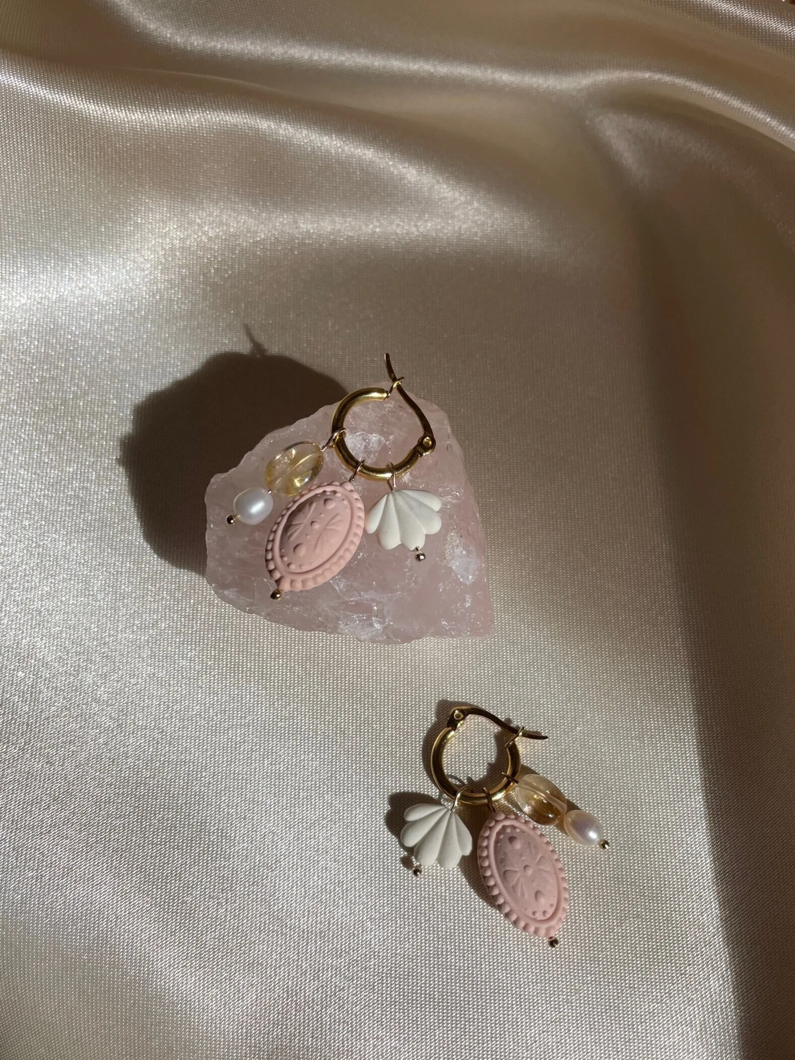 The Clarita Charm Hoop Earrings in ‘Day Dream’ are a best seller! These gorgeous statement earrings are made of 18K gold-plated lever-back hoops, 14K gold-filled findings, signature Aester & Pearl designed polymer clay beads in pink and ivory, as well as genuine Citrine crystals and natural freshwater pearls. Click the shop link below!